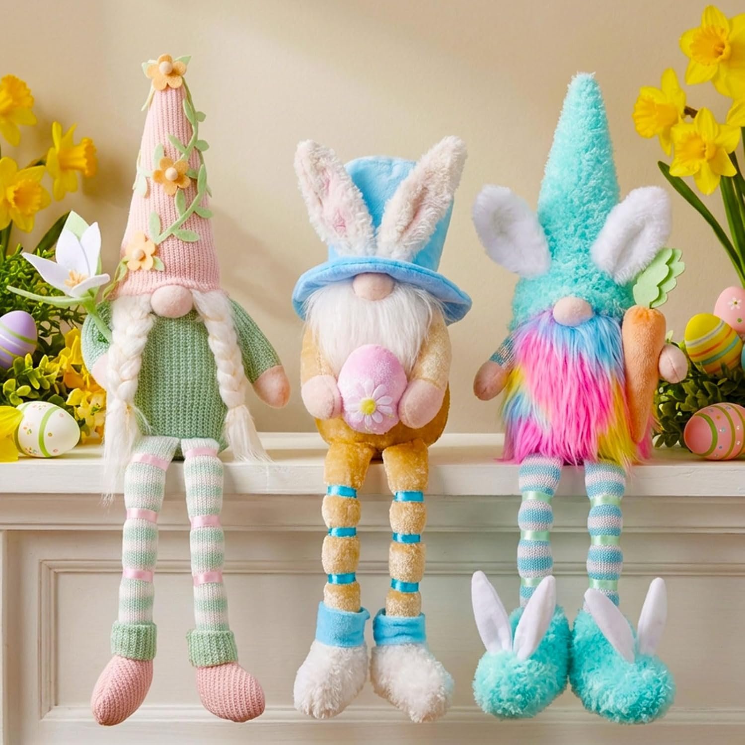 This trio of plush bunny gnomes makes a fun Easter gift for anyone who enjoys playful seasonal decorations. With their long dangling legs and sweet spring details, they add a whimsical touch to shelves, tiered trays, or tabletops. A cheerful decorative set that brings a little extra personality to Easter and spring displays.